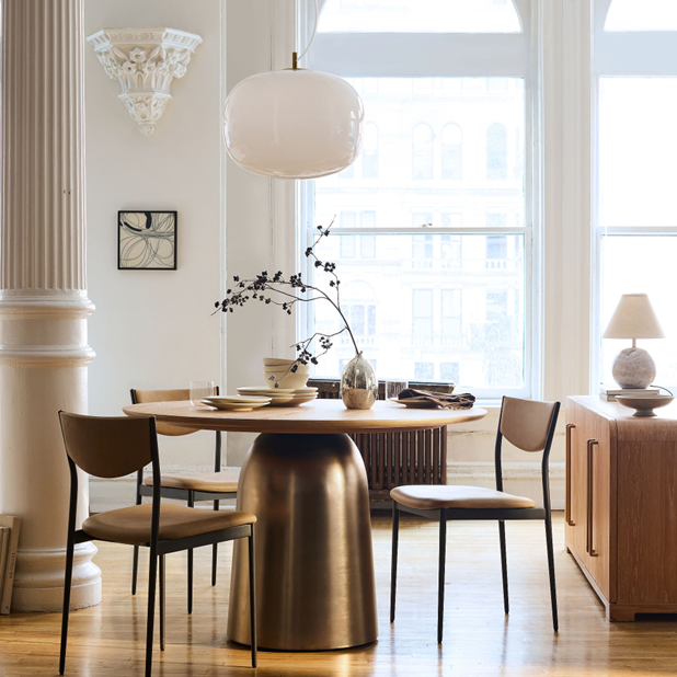 - Classic sloped waterfall edges inspired by ’70s forms.